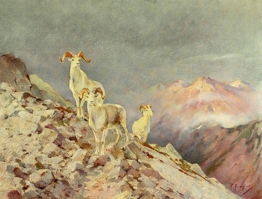 Rams White Modern Wood Framed Art Print with Double Matting by Rungius, Carl