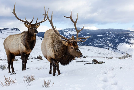 USA- Wyoming- Yellowstone National Park. Pair of bull elk in snow Black Ornate Wood Framed Art Print with Double Matting by Gulin, Darrell