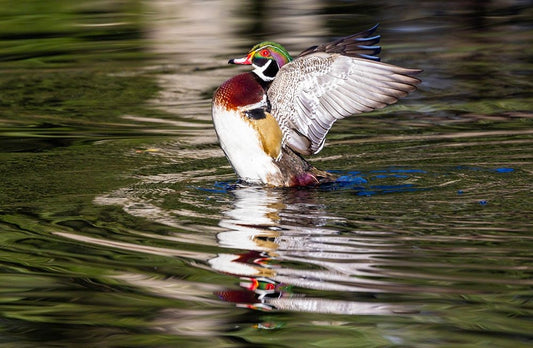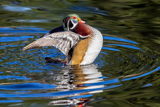 USA- Washington State- Sammamish. Yellow Lake with male drake wood duck flapping wings Black Ornate Wood Framed Art Print with Double Matting by Gulin, Darrell
