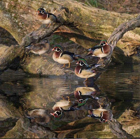 Male and female wood ducks-resting on fallen tree-Kentucky Black Ornate Wood Framed Art Print with Double Matting by Jones, Adam