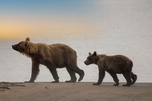 Brown bear cub and sow walk a Cook Inlet beach. Black Ornate Wood Framed Art Print with Double Matting by Sederquist, Betty