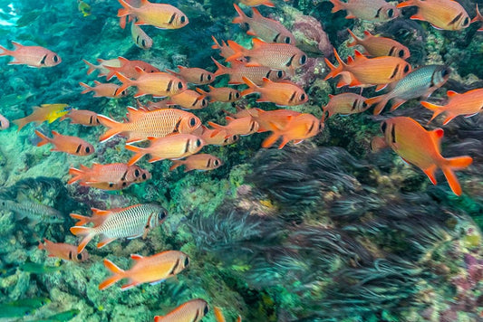 French Polynesia- Moorea. School of soldierfish and coral. Black Ornate Wood Framed Art Print with Double Matting by Jaynes Gallery