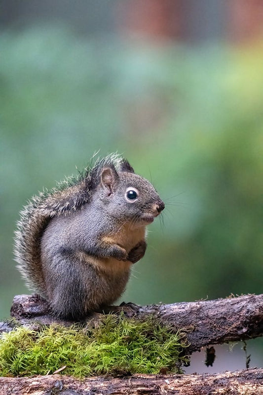 Douglas Squirrel standing on back paws on a moss-covered log Black Ornate Wood Framed Art Print with Double Matting by Horton, Janet
