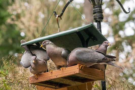 Flock of Band-tailed Pigeons cramming into a birdfeeder Black Ornate Wood Framed Art Print with Double Matting by Horton, Janet