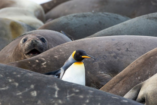 Southern Ocean-South Georgia-A large elephant seal bull lies in the midst of many penguins Black Ornate Wood Framed Art Print with Double Matting by Goff, Ellen B.