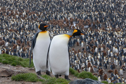 Southern Ocean-South Georgia-St-Andrews Bay-Two adults stand together overlooking the crowded colony Black Ornate Wood Framed Art Print with Double Matting by Goff, Ellen B.