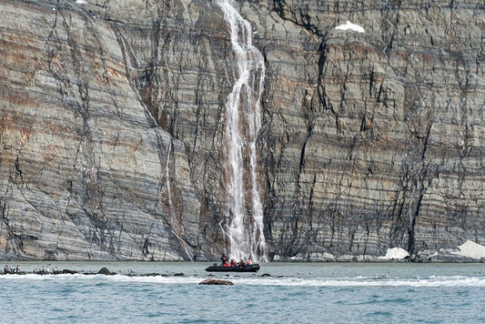 Zodiac approaching waterfall and king penguins on the beach-Gold Harbour-South Georgia-Antarctica Black Ornate Wood Framed Art Print with Double Matting by Su, Keren