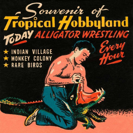 Tropical Hobbyland - Alligator Wrestling Black Ornate Wood Framed Art Print with Double Matting by Retrotravel