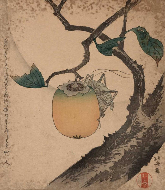 Grasshopper eating persimmon, 1850 Black Ornate Wood Framed Art Print with Double Matting by Hokusai