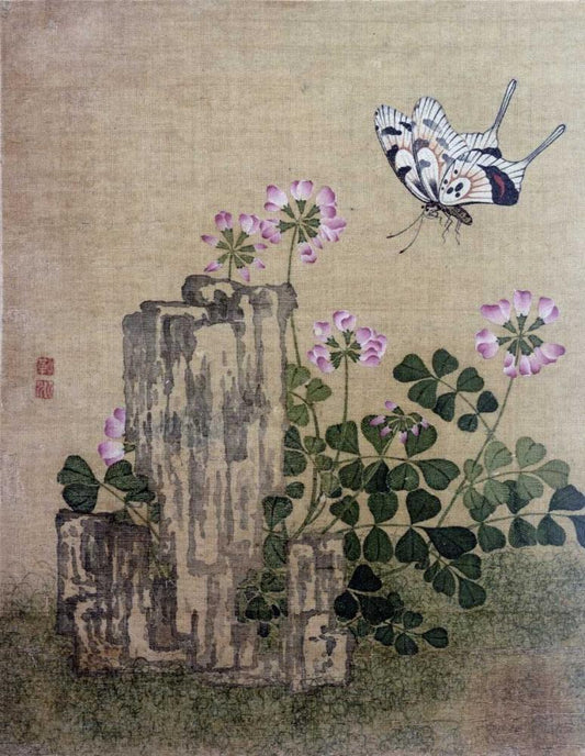 Corn Poppy and Butterflies Black Ornate Wood Framed Art Print with Double Matting by Yuanyu, Ma