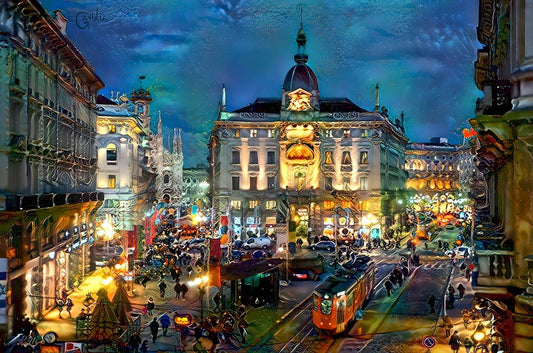 Milan Italy Piazza Cardusio Night White Modern Wood Framed Art Print with Double Matting by Gavidia, Pedro
