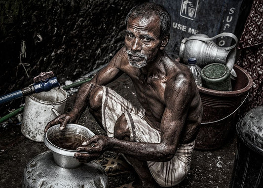 Man Filling A Pitcher With Water In The Streets Of Bangladesh. Black Ornate Wood Framed Art Print with Double Matting by Inazio Kuesta, Joxe