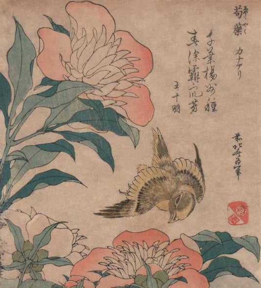 Peony and Canary, 1833 Black Ornate Wood Framed Art Print with Double Matting by Hokusai