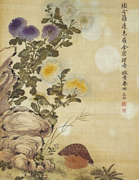 Chrysanthemums and Quail Black Ornate Wood Framed Art Print with Double Matting by Yuanyu, Ma