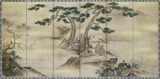 Birds, Flowers and Monkeys Six-Panel Screen Black Ornate Wood Framed Art Print with Double Matting by Kano School