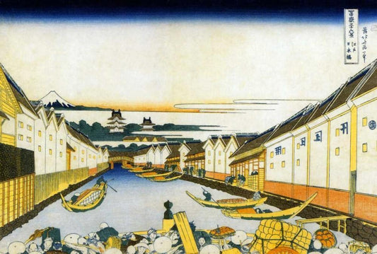 Mount Fuji And Edo Castle Seen From Nihonbashi 1834 White Modern Wood Framed Art Print with Double Matting by Hokusai