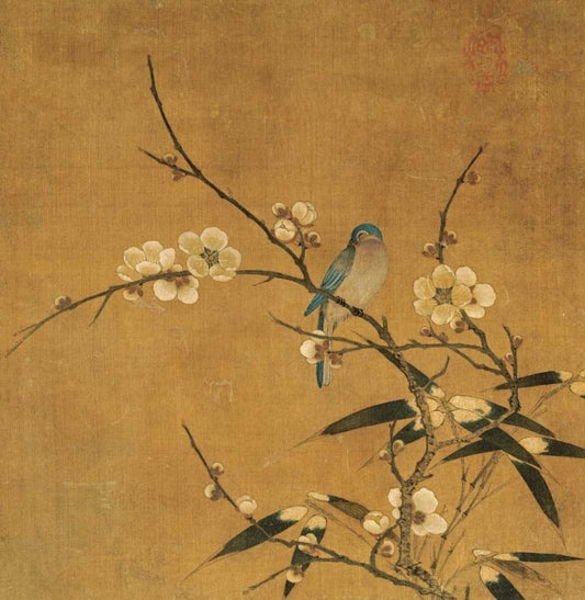 Blue Bird On a Plum Branch With Bamboo White Modern Wood Framed Art Print with Double Matting by Unknown