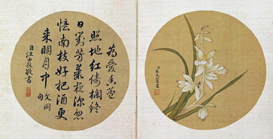 Flowers and Calligraphy White Modern Wood Framed Art Print with Double Matting by Weibang, Zhang