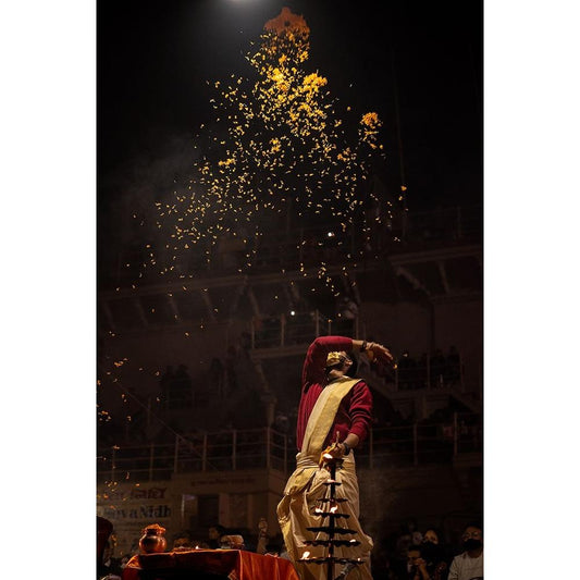 Ganga Aarti-101 Gold Ornate Wood Framed Art Print with Double Matting by Chakraborty, Debopam