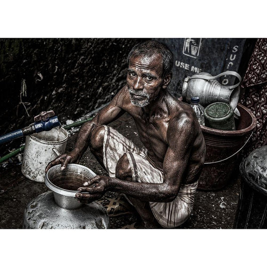 Man Filling A Pitcher With Water In The Streets Of Bangladesh. Gold Ornate Wood Framed Art Print with Double Matting by Inazio Kuesta, Joxe