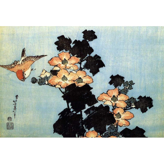 Hibiscus And Sparrow Gold Ornate Wood Framed Art Print with Double Matting by Hokusai
