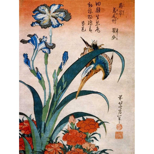 Kingfisher With Irises And Wild Pinks Gold Ornate Wood Framed Art Print with Double Matting by Hokusai