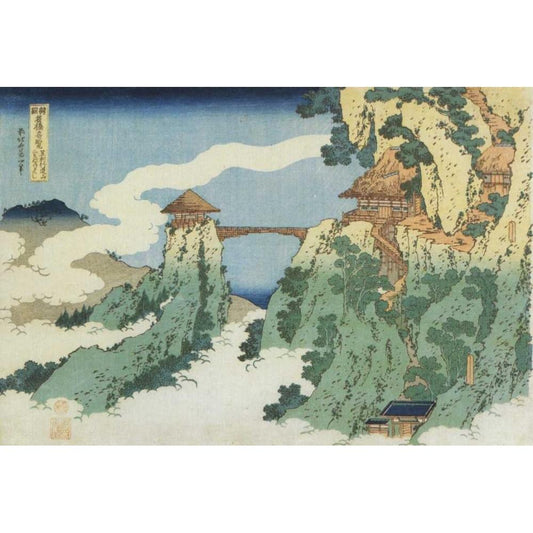 The Hanging Cloud Bridge At Mount Gyodo Near Ashikaga Gold Ornate Wood Framed Art Print with Double Matting by Hokusai