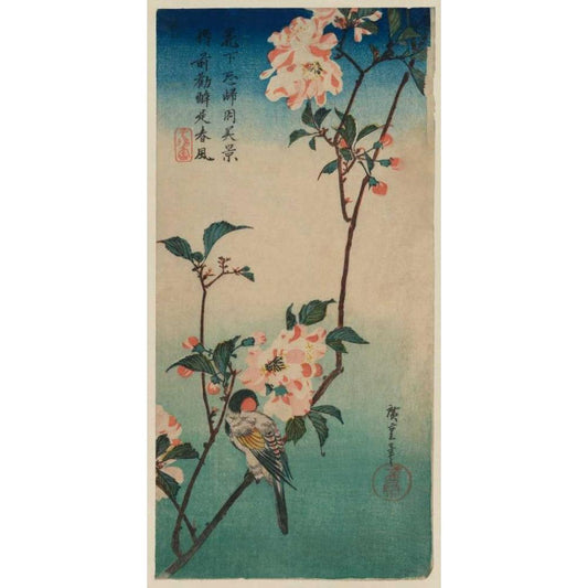 Small bird on a branch of Kaidozakura Gold Ornate Wood Framed Art Print with Double Matting by Hiroshige, Ando