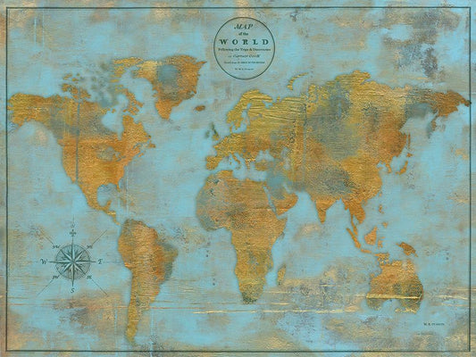 Rustic World Map Sky Blue White Modern Wood Framed Art Print with Double Matting by Elaine-Cusson, Marie