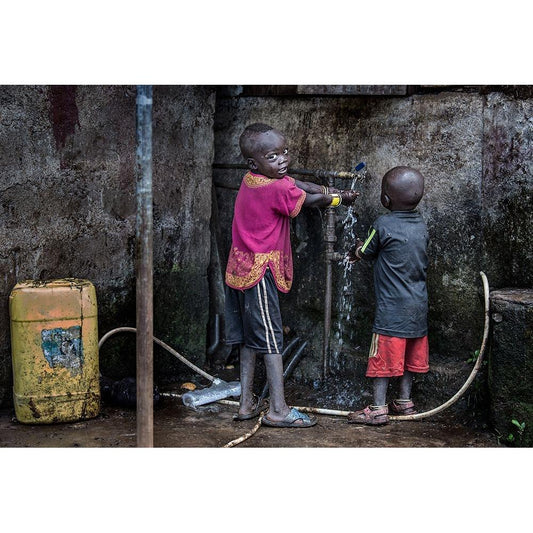 Surmi Tribe Children Cleaning Their Hands Before Starting To Eat - Ethiopia Black Modern Wood Framed Art Print by Inazio Kuesta, Joxe