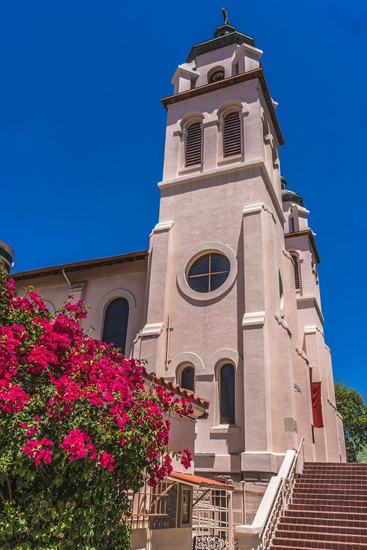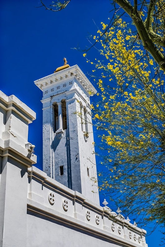 Bell tower- Santa Cruz Church- Tucson- Arizona. Founded 1918. Black Modern Wood Framed Art Print by Perry, William