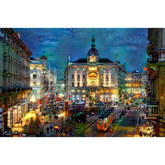 Milan Italy Piazza Cardusio Night Black Modern Wood Framed Art Print by Gavidia, Pedro