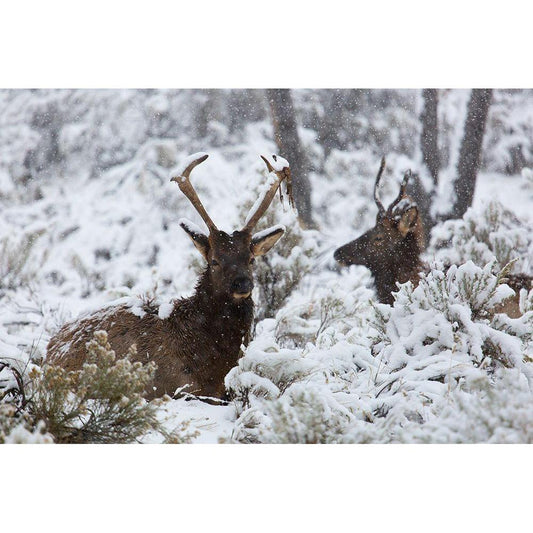 Young Bull Elk on Snowy Day, Yellowstone National Park Gold Ornate Wood Framed Art Print with Double Matting by The Yellowstone Collection