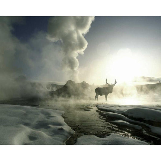 WY, Yellowstone, Castle Geyser Silhouette of elk Gold Ornate Wood Framed Art Print with Double Matting by Zuckerman, Jim