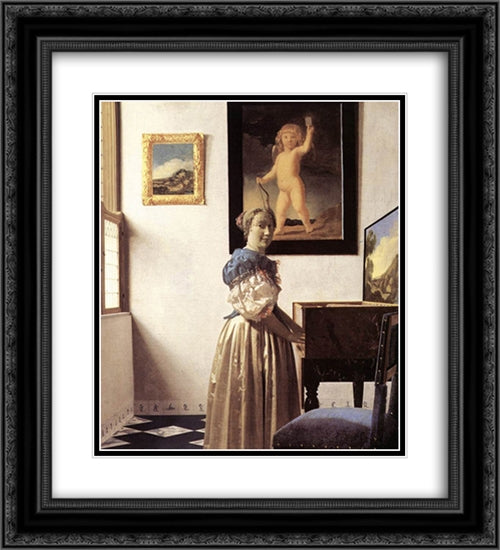 Lady Standing at a Virginal 20x22 Black Ornate Wood Framed Art Print Poster with Double Matting by Vermeer, Johannes