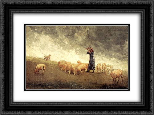 Shepherdess Tending Sheep 24x18 Black Ornate Wood Framed Art Print Poster with Double Matting by Homer, Winslow