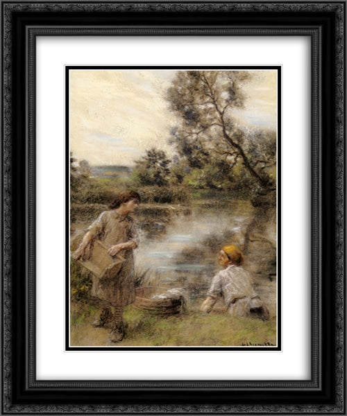 Laveuses bord de Marne ou Lavandiere et sa fille au bord de la riviere 20x24 Black Ornate Wood Framed Art Print Poster with Double Matting by L'Hermitte, Leon Augustin