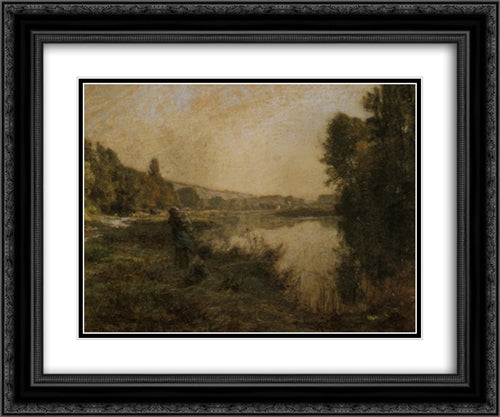 Fishing along a river 24x20 Black Ornate Wood Framed Art Print Poster with Double Matting by L'Hermitte, Leon Augustin
