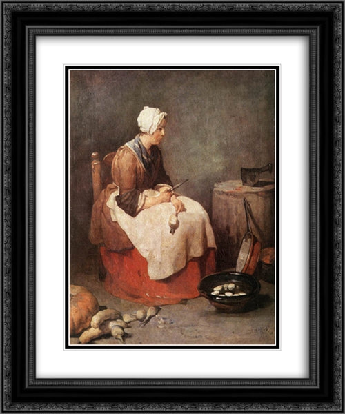 Girl Peeling Vegetables 20x24 Black Ornate Wood Framed Art Print Poster with Double Matting by Chardin, Jean Baptiste Simeon