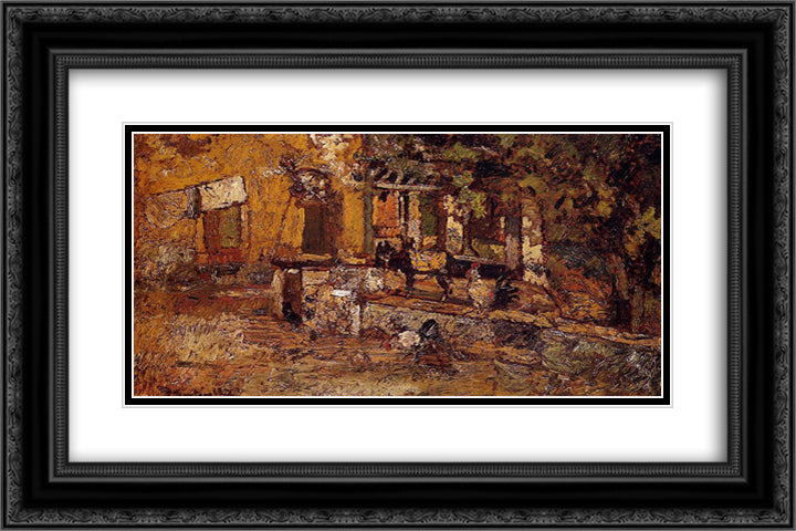 Farmyard with Donkeys and Roosters 24x16 Black Ornate Wood Framed Art Print Poster with Double Matting by Monticelli, Adolphe Joseph Thomas