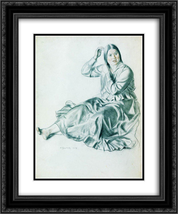 Girl brushing her hair 20x24 Black Ornate Wood Framed Art Print Poster with Double Matting by Kustodiev, Boris