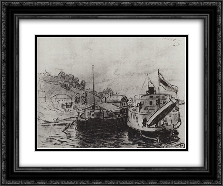 Kineshma. Steamer at the pier 24x20 Black Ornate Wood Framed Art Print Poster with Double Matting by Kustodiev, Boris