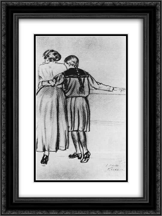 On the bridge (the wife and daughter of the artist) 18x24 Black Ornate Wood Framed Art Print Poster with Double Matting by Kustodiev, Boris