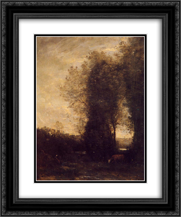A Cow and its Keeper 20x24 Black Ornate Wood Framed Art Print Poster with Double Matting by Corot, Jean Baptiste Camille