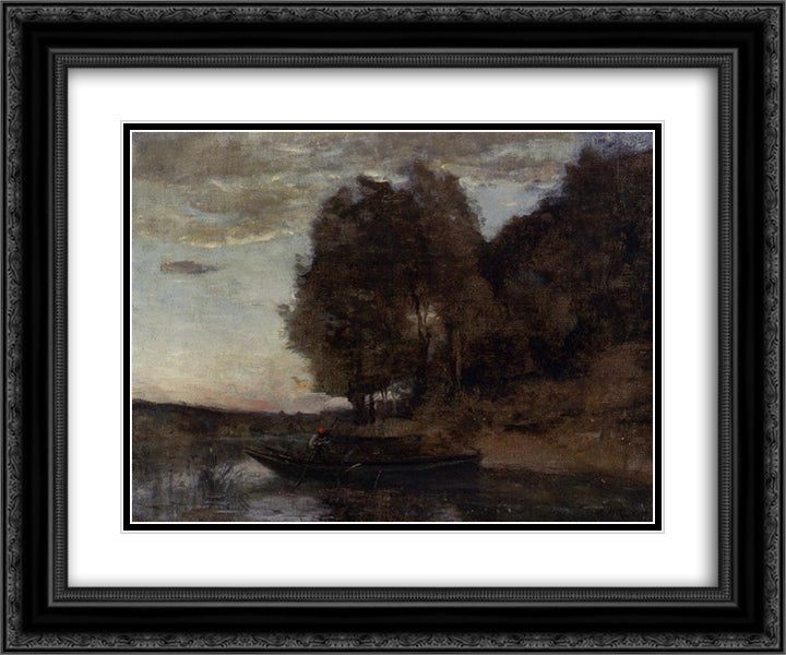 Fisherman Boating along a Wooded Landscape 24x20 Black Ornate Wood Framed Art Print Poster with Double Matting by Corot, Jean Baptiste Camille