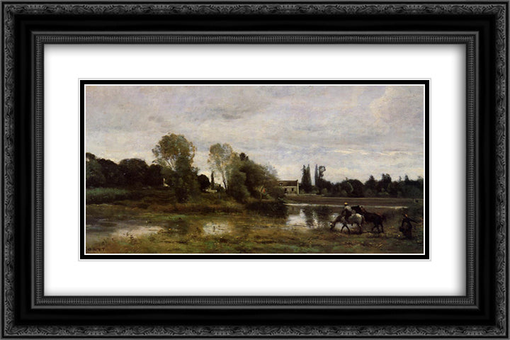 Ville d'Avray, Horses Watering 24x16 Black Ornate Wood Framed Art Print Poster with Double Matting by Corot, Jean Baptiste Camille