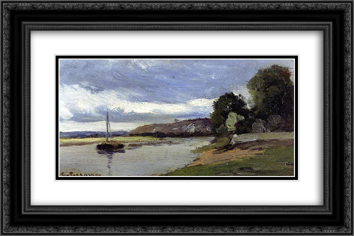Banks of a River with Barge 24x16 Black Ornate Wood Framed Art Print Poster with Double Matting by Pissarro, Camille