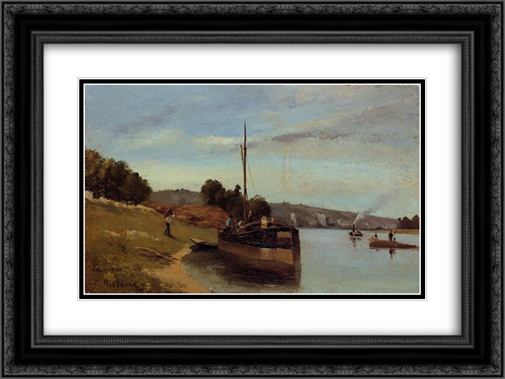 Barges at Le Roche Guyon 24x18 Black Ornate Wood Framed Art Print Poster with Double Matting by Pissarro, Camille