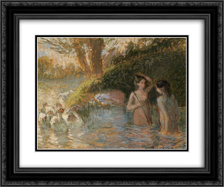 Bathing Goose Maidens 24x20 Black Ornate Wood Framed Art Print Poster with Double Matting by Pissarro, Camille
