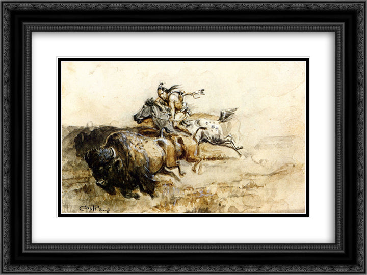 Buffalo Hunter 24x18 Black Ornate Wood Framed Art Print Poster with Double Matting by Russell, Charles M.